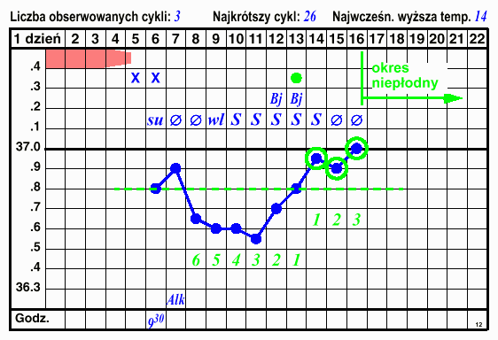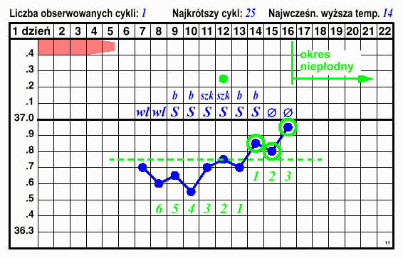 Jeżeli powyższe warunki są spełnione, wieczór 3-go dnia temperatury wyższej uznajemy za niepłodny. Okres niepłodny trwa aż do miesiączki i w tym czasie nie musimy już mierzyć temperatury ani obserwować śluzu.